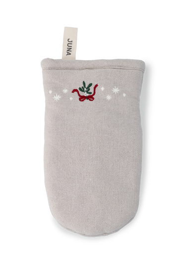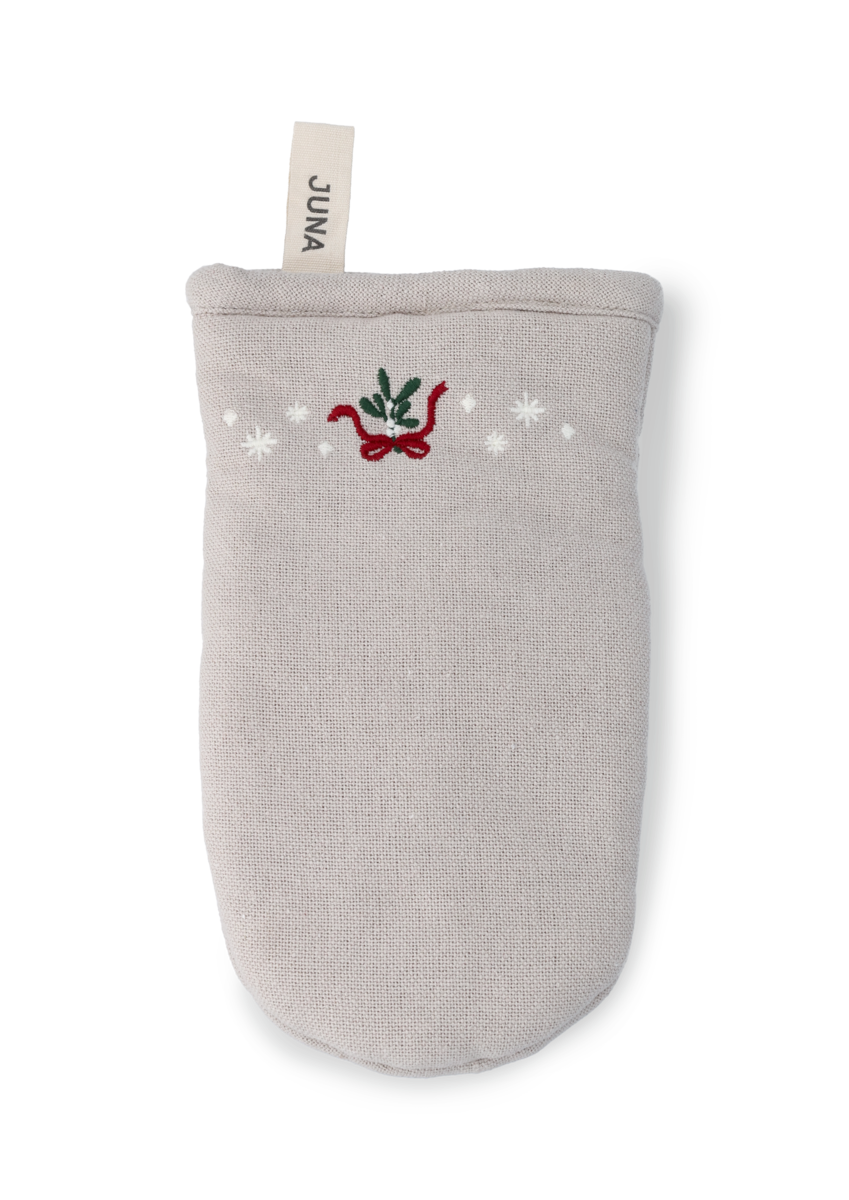 Denne ovnhandske i en klassisk sandfarve, vil bringe varme og juleglæde til dit køkken. Ovnhandsken er dekoreret med et broderet motiv af seriens mistelten, som er omgivet af de yndigste små julestjerner.