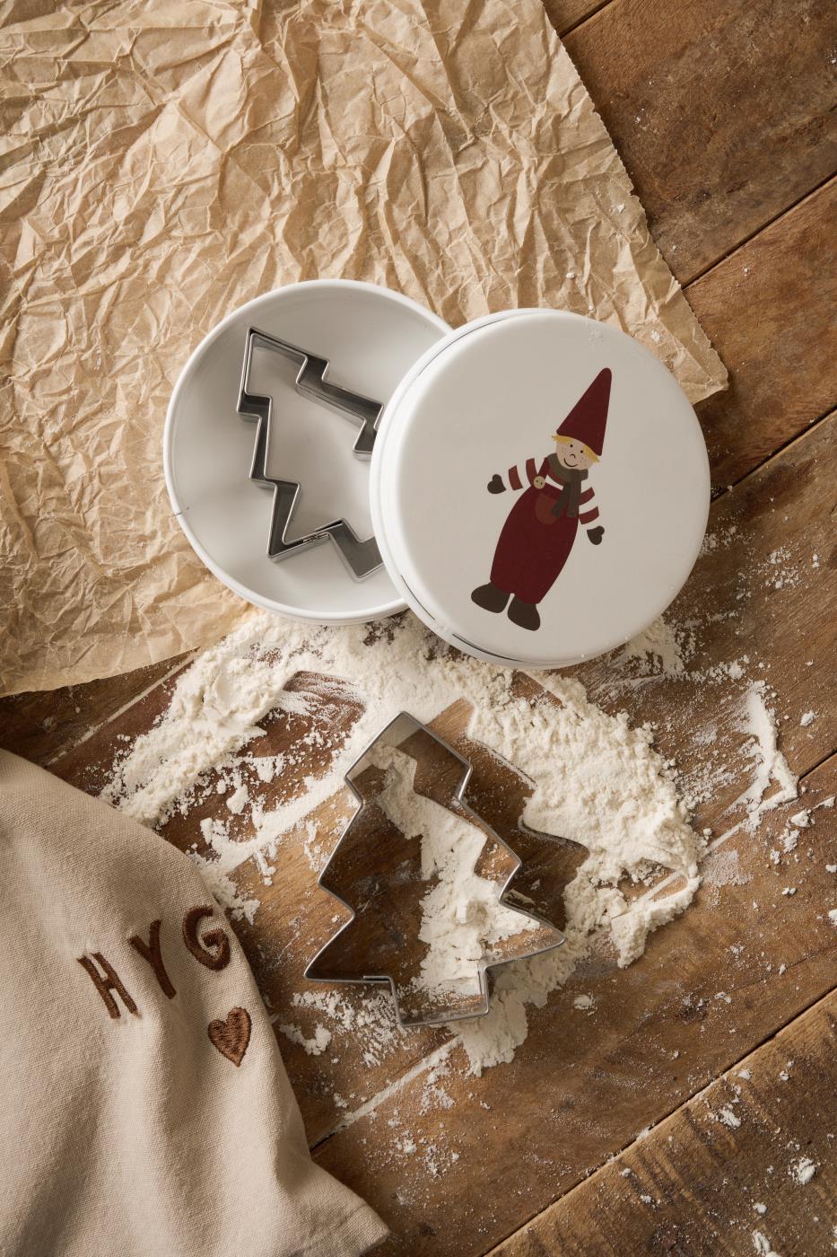 Bag julens søde små overraskelser med denne fine metaldåse, der gemmer på 3 juletræ-formede kageudstikkere.