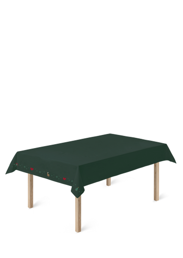 Den dybrøde dug er pyntet med fine detaljer af rensdyr, hjerter og stjerner, der bringer varme og glæde til dit julebord.