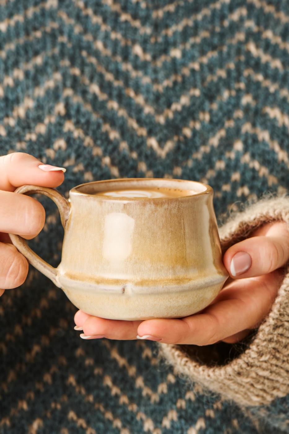 Krusets glasur er et flot mix af lysebrune nuancer, som giver koppen et håndmalet look.