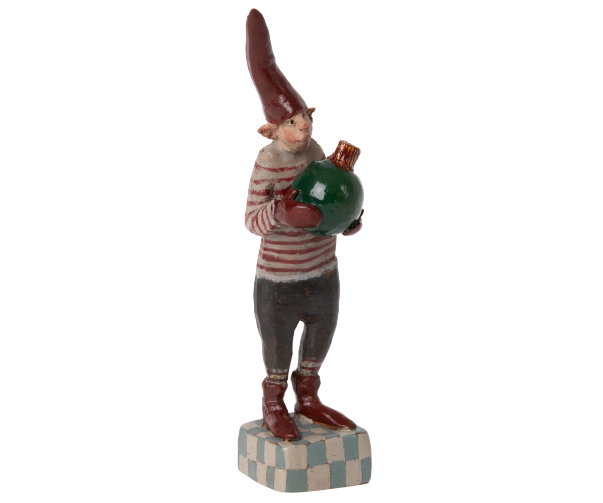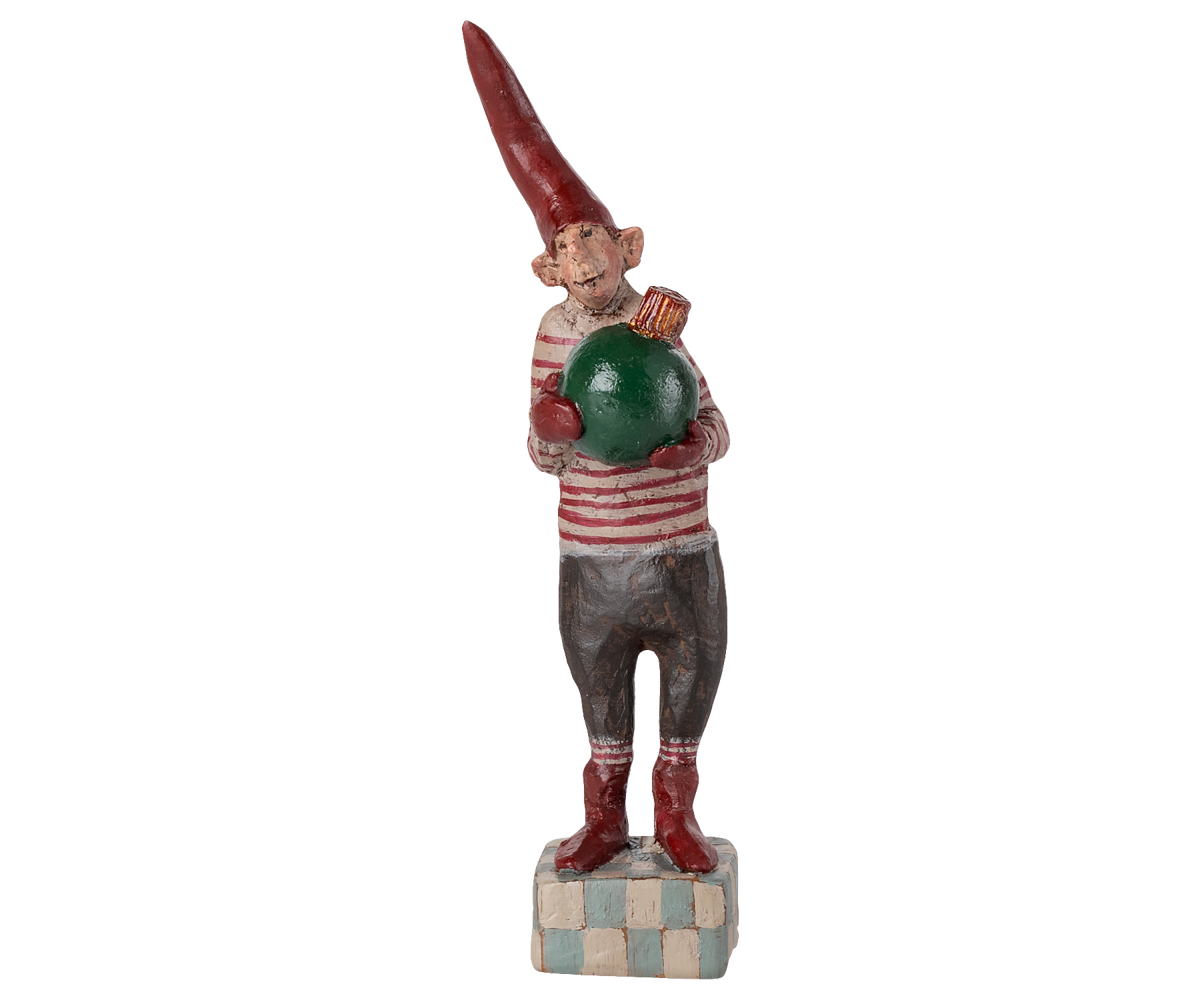 Charmerende Noilly Noël figur med grøn julekugle i hænderne og stribet bluse.