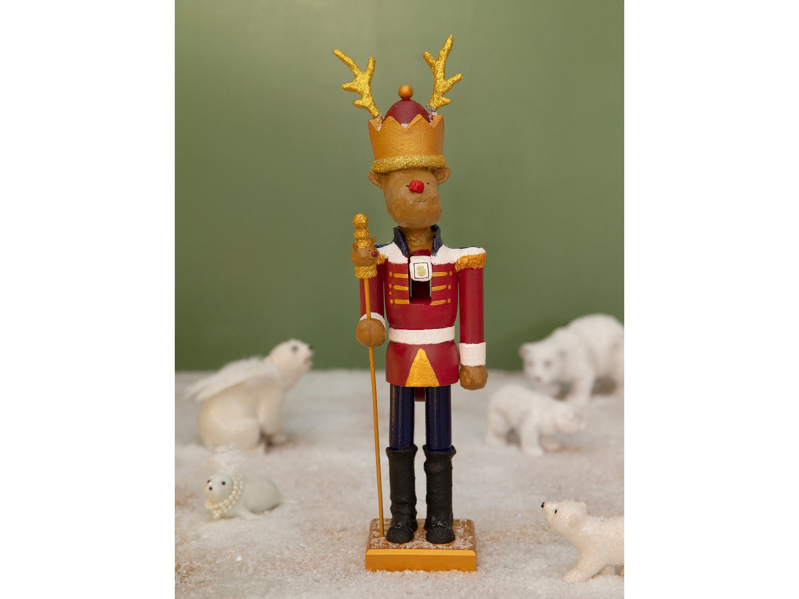 Den skønne Rudolf er trukket i en flot rød jakke og stråler om kap med det glitrende scepter.
