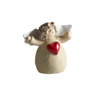 Denne charmerende lille engel fra Näägränsgården løfter armene og bærer et rødt hjerte på brystet – et symbol på glæde, håb og varme. Med sine bløde former, sarte farver og fine vinger bringer hun et strejf af fred og kærlighed til hjemmet.
