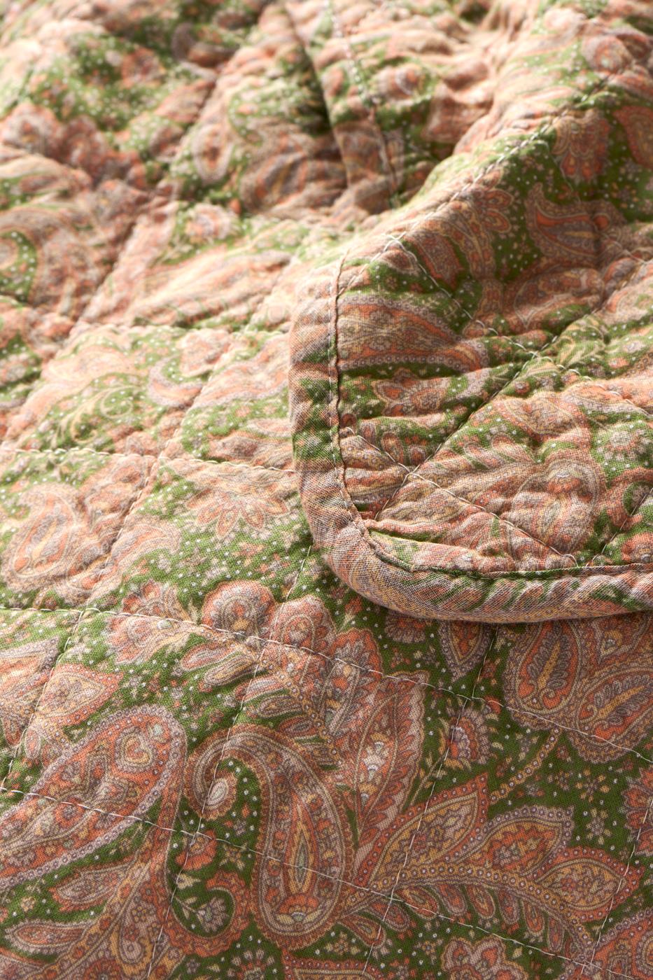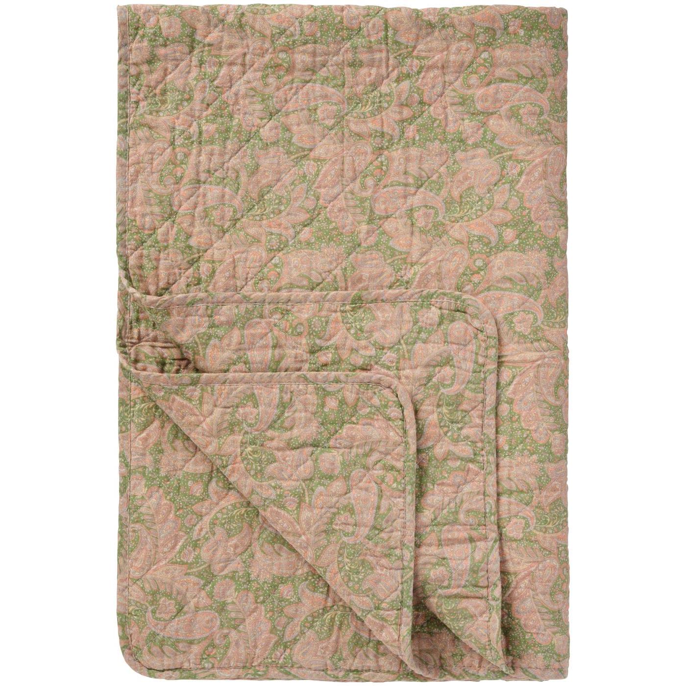 Smukt quiltet tæppe med grønt og rosa paisleymønster.