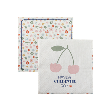 Den flotte Cherry serviet fra Bloomingville har et farverigt og legende udtryk, med fine blomster og kirsebær på den ene side og et stort kirsebær med tekst på den anden side.