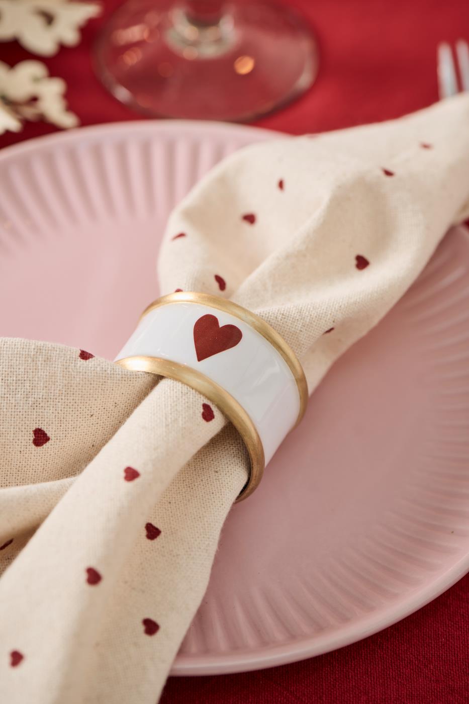 En fin stofserviet i lys naturfarve med små røde hjerter, der giver bordet et varmt og personligt udtryk.