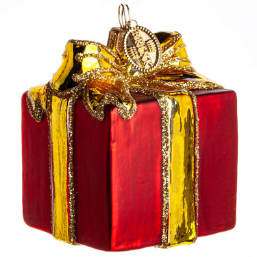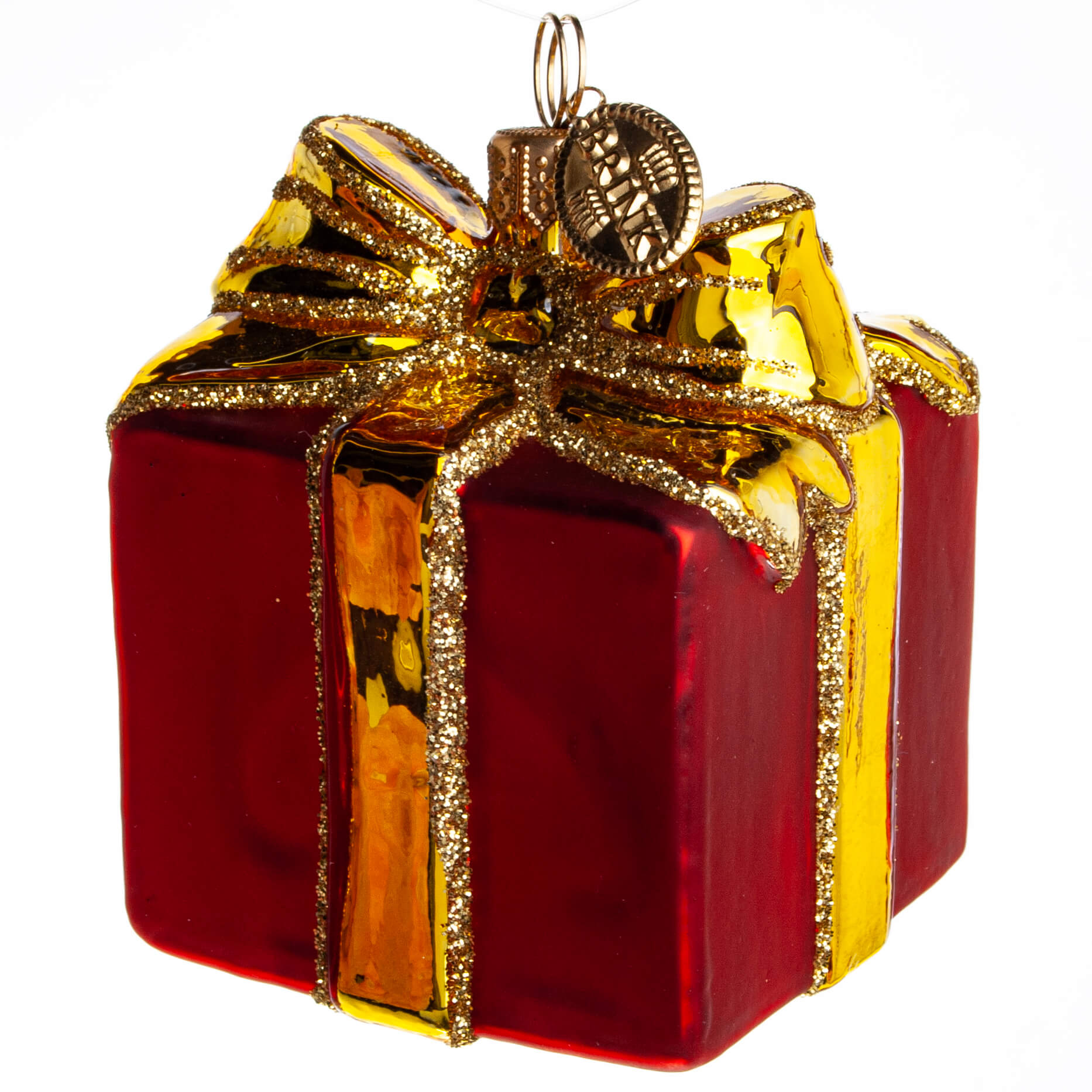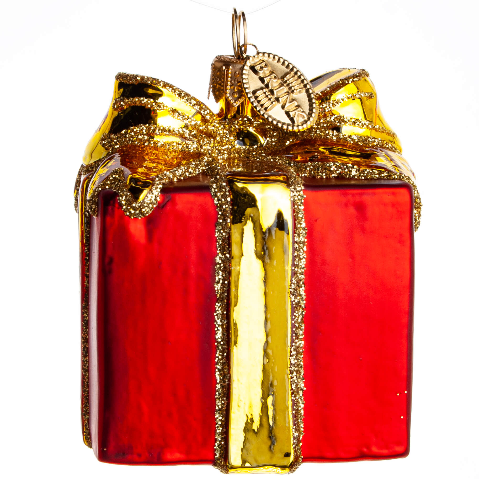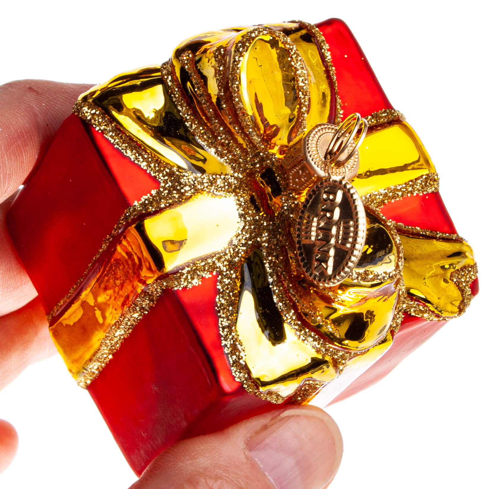 Den flotte røde gave vil pynte både som glaspynt til juletræet eller som bordkortholder på julebordet.
