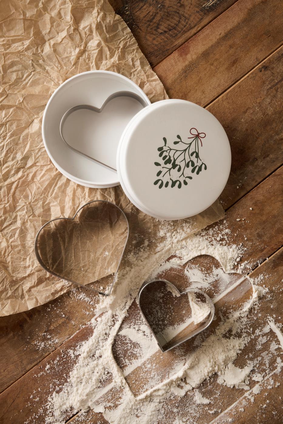 Bag julens søde små overraskelser med denne fine metaldåse, der gemmer på 3 hjerte-formede kageudstikkere.