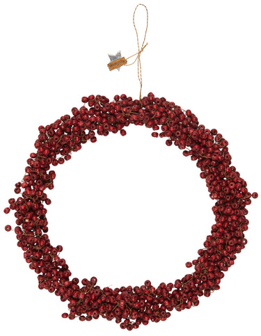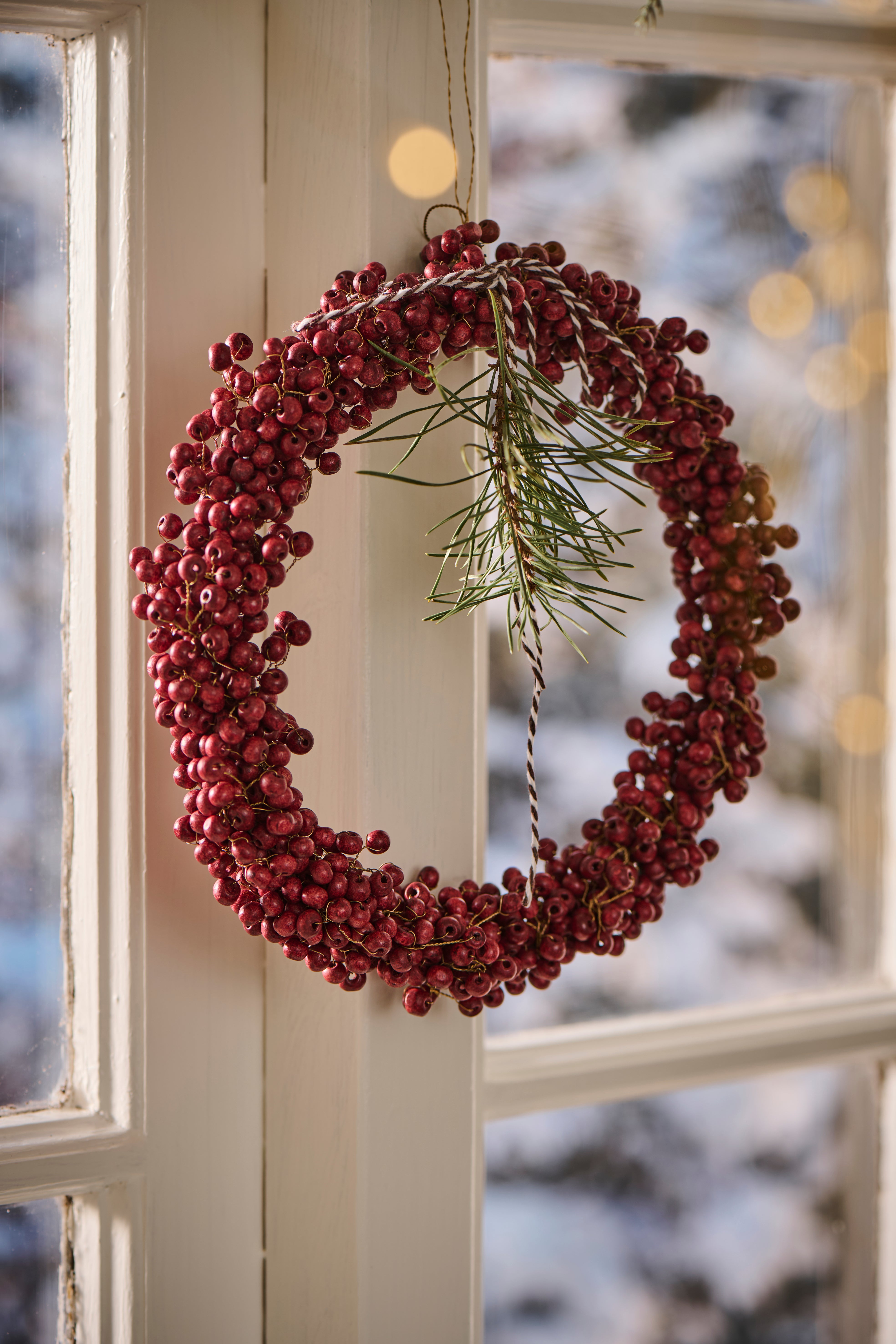 De mørkerøde perler giver kransen et både hyggeligt og varmt udtryk - helt perfekt til at skabe skøn julestemning eller blot som dekoration i hjemmet hele året.