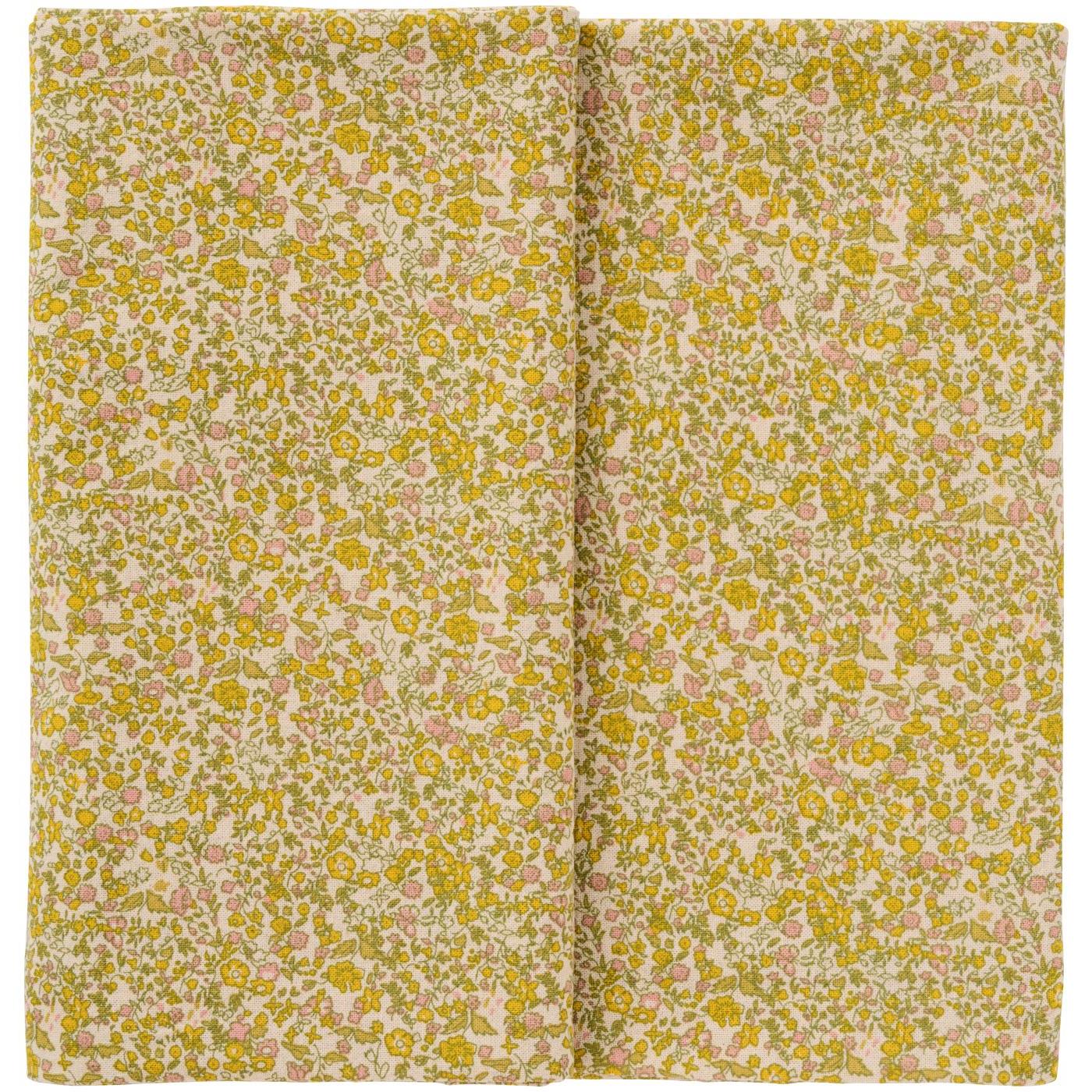 Flot blomstret bomuldsdug fra Ib Laursen med natur bund samt gule, grønne og rosa blomster.