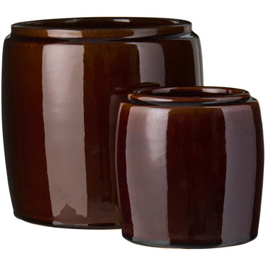 Disse cylinderformede krukker fås i to størrelser og er udført i brun med en rustik glasur, der skaber et smukt farvespil i bløde, lyse nuancer.