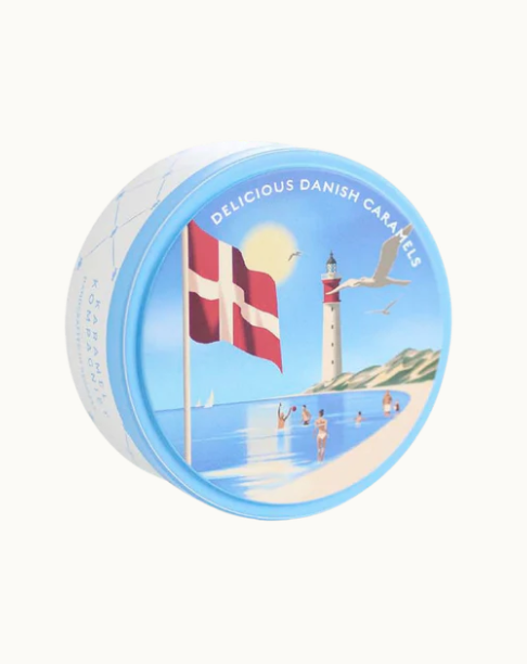 Dåsens smukke motiv med det danske flag, fyrtårn og sommerliv ved kysten indfanger den helt særlige danske sommerstemning. Indeni gemmer sig klassiske flødekarameller med sydesalt, nænsomt lavet på Bornholm.