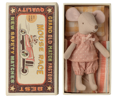 Den fine mus sover trygt i den lille tændstikæske. Hendes tøj og sengetøj er lavet i det blødeste stof i smukke farver og med unikt print.