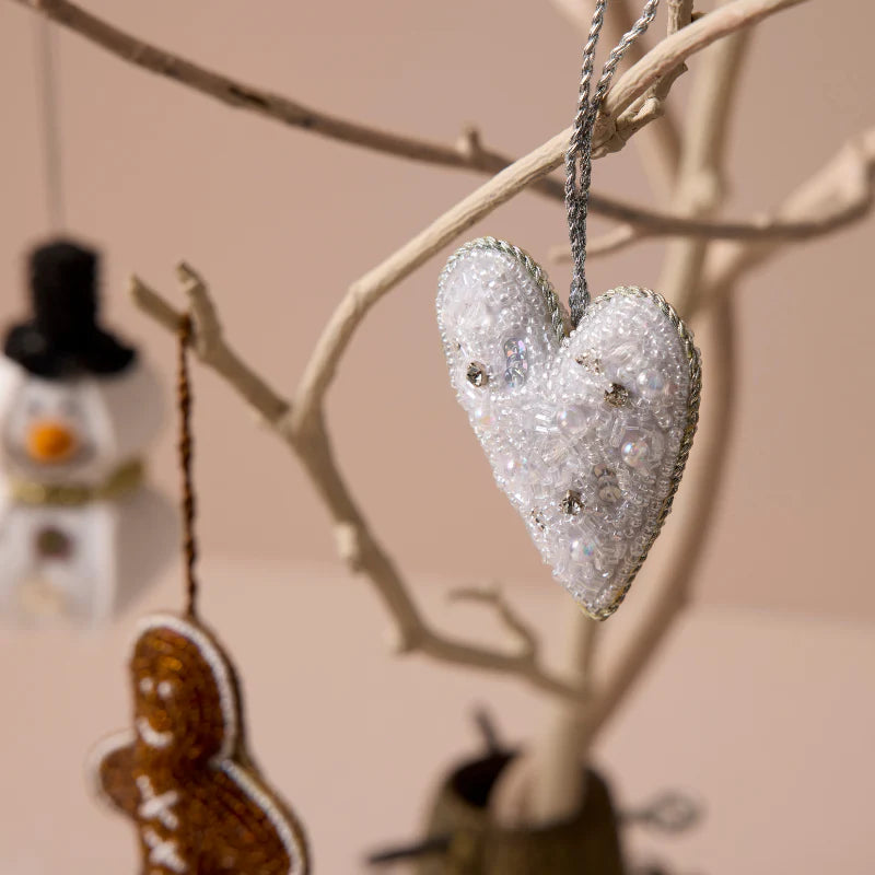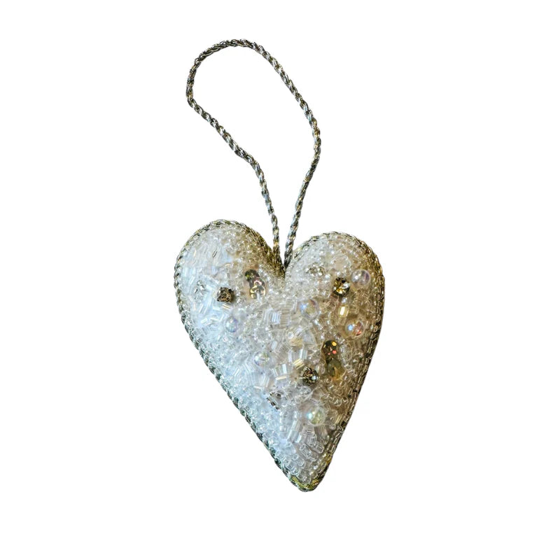 Håndsyet hvidt hjerte med perler og sten – unik julepynt til dit hjem.