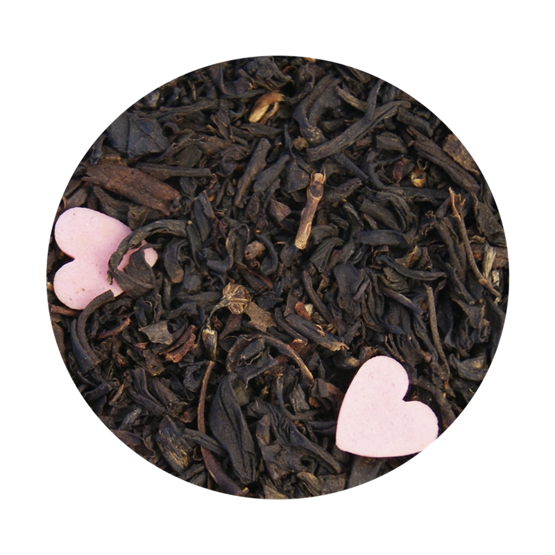 Ingredienser: Sort te (94%), sukkerhjerter (sukker, solsikkeolie, kartoffelstivelse, rismel, farve: E120,E101, bærestof: E555, overfladebehandlingsmiddel:E904)(5%) og aroma.