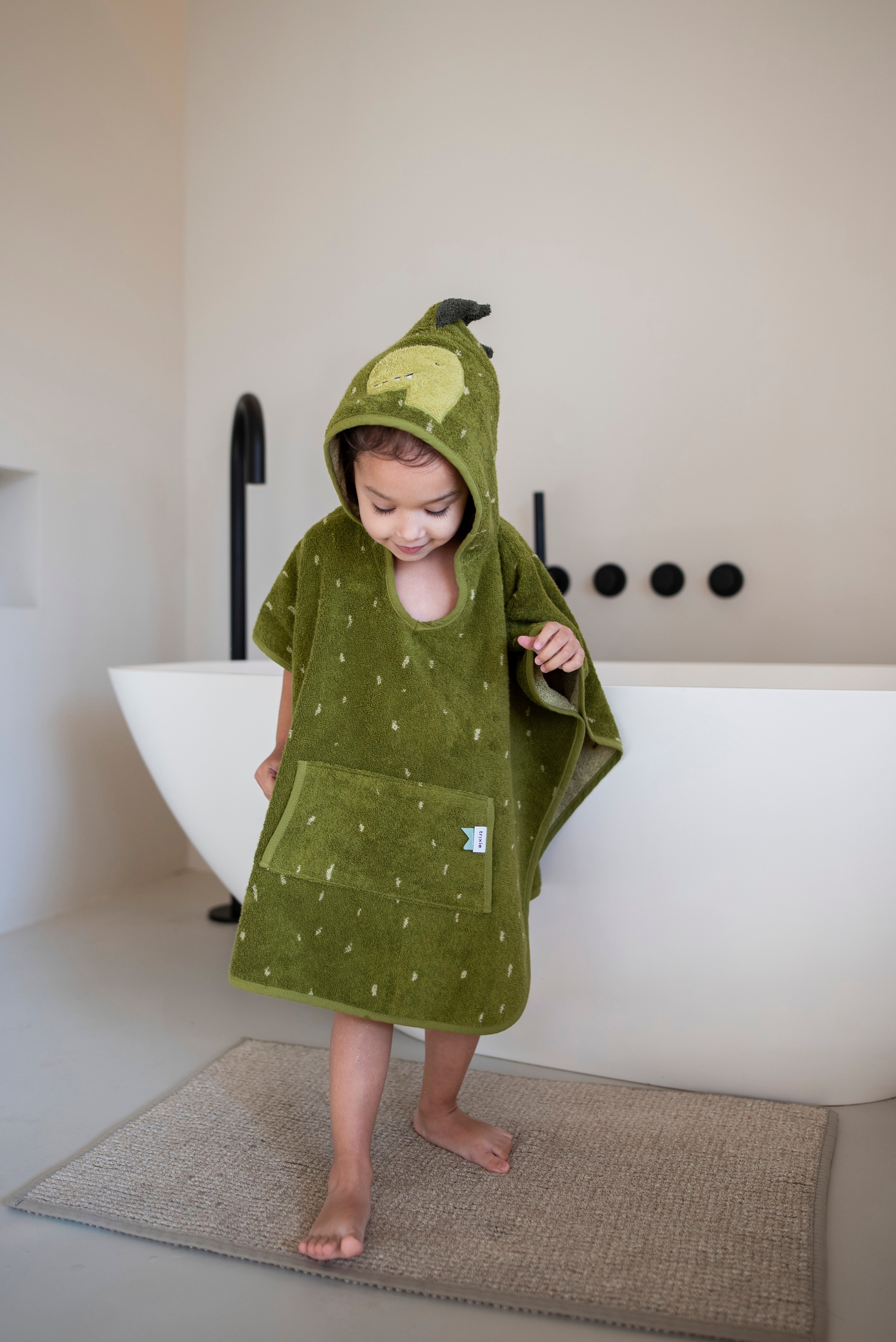 Ponchoen har en praktisk hætte med søde små takker og dinosaur ansigt, og er nem at trække over hovedet på barnet så det bliver holdt varmt og trygt efter badet.