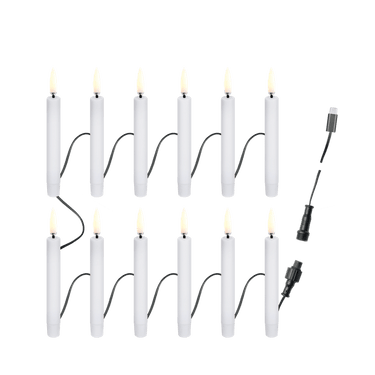 Skab magisk julestemning med dette smukke sæt af 12 små LED stagelys, der er forbundet med ledning og gør pyntningen nem og dekorativ. Perfekt til juletræet, guirlander eller andre festlige dekorationer – du får den hyggelige glød af levende lys, helt uden brandfare.