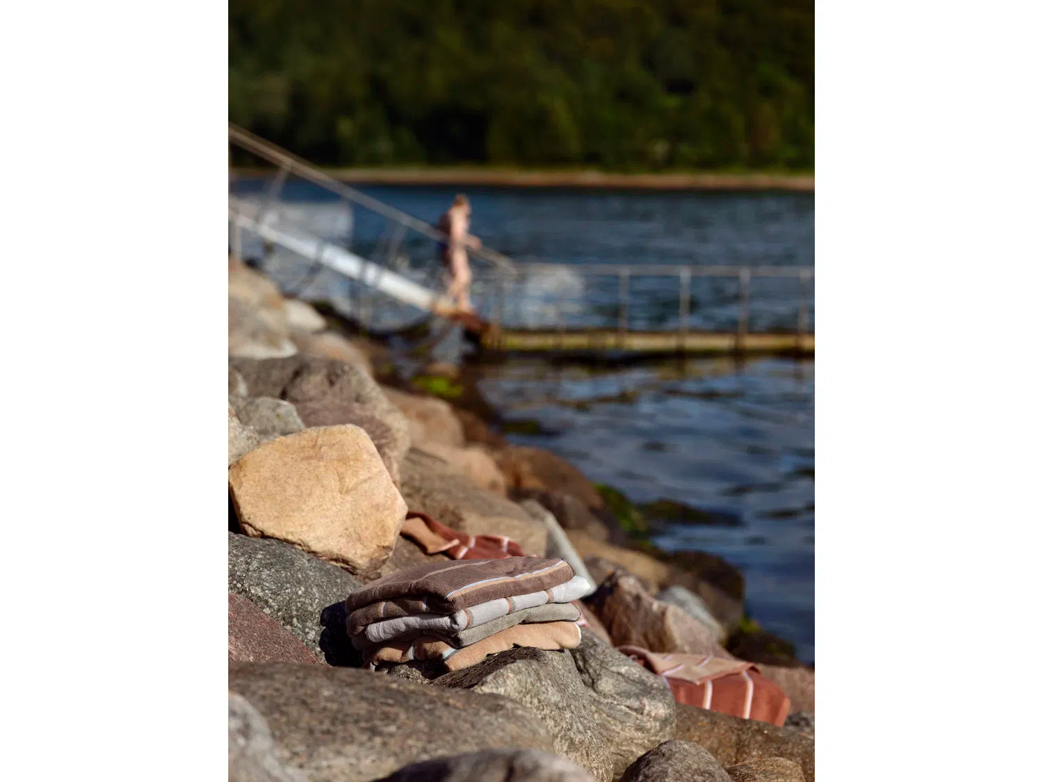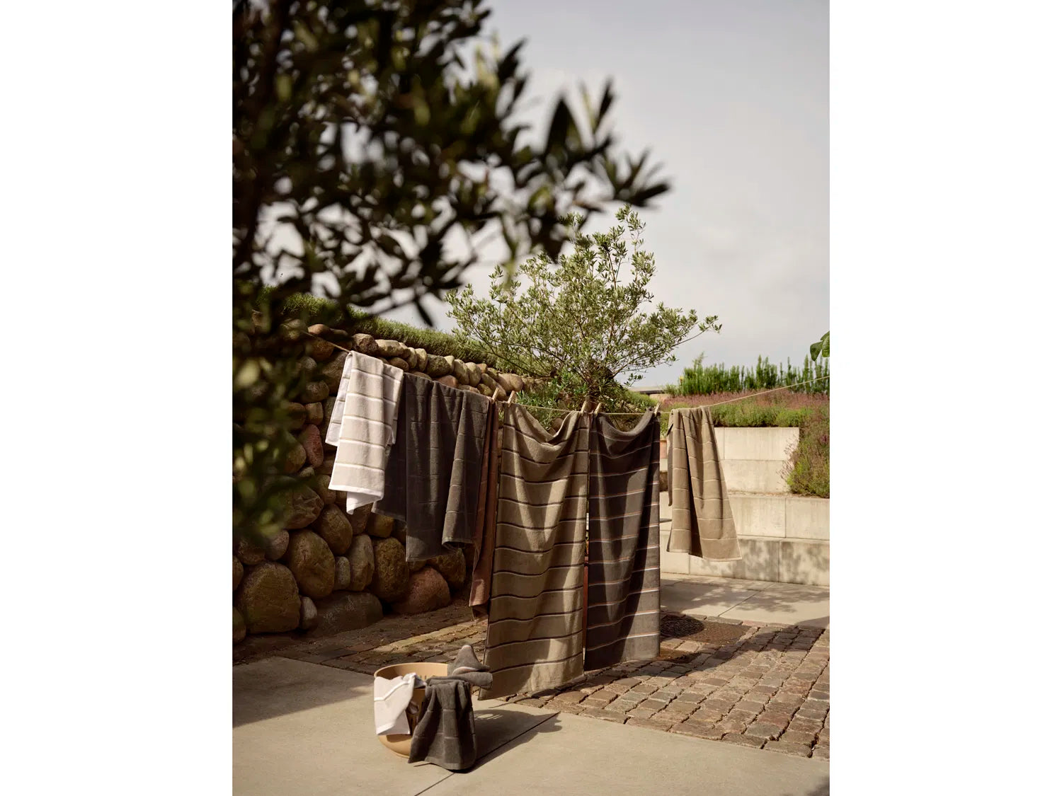 Serien er inspireret af de stramme linjer fra en klassisk træbeklædt sauna, hvor designet leger elegant med perspektiv og harmoniske farvekombinationer.